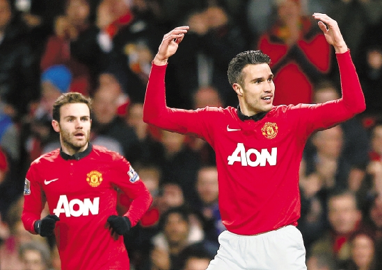1月28日,在2013-2014赛季英格兰足球超级联赛第23轮比赛中,曼彻斯特联队主场以2比0战胜卡迪夫城。目前离英超四强席位尚有6分之差。图为曼联队球员范佩西(右)庆祝进球。 新华社发