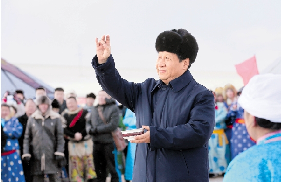 1月27日,在锡林浩特市宝力根苏木(乡)冬季那达慕“五畜祈福”仪式上,习近平按照蒙古族习俗,用无名指蘸上银碗盛着的鲜牛奶弹了三下,祝福来年风调雨顺,五畜兴旺,人民幸福安康。 新华社记者 庞兴雷 摄