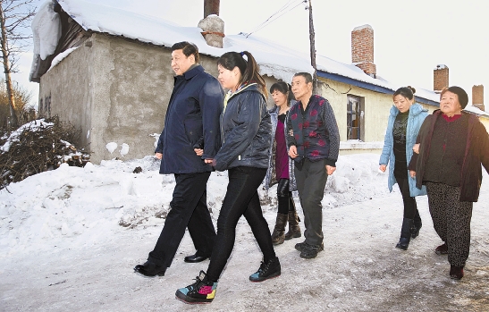 这是1月26日,习近平冒着零下30多度的严寒,来到兴安盟阿尔山市伊尔施镇,看望慰问74岁的困难林业职工郭永财一家。 新华社记者 兰红光 摄