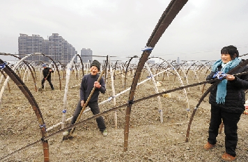 2月5日,来自温岭箬横的蒋遇青正忙着搭架开沟,栽种西瓜苗。今年是他在嘉兴租地种西瓜的第二年,去年他种植大棚西瓜收入数十万元。 本报记者 储永志 摄