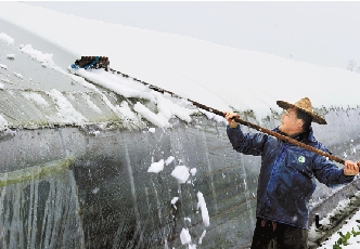2月9日, 武义县熟溪街道南缸窑村菜农徐法明冒严寒清除蔬菜大棚积雪。 张建成 摄