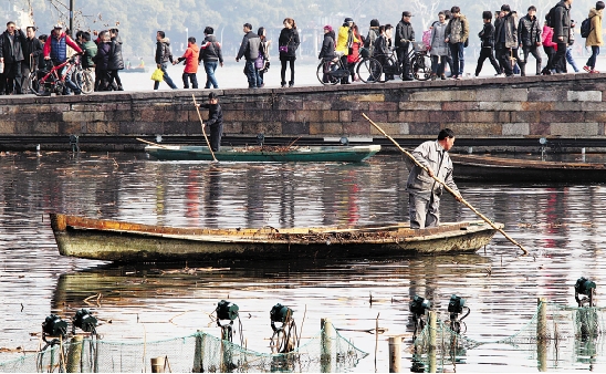 2月15日,杭州西湖断桥荷花区,几名工人趁着晴好天气,全面清理残荷,为今年新一轮荷花种植做准备。