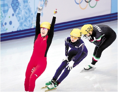2月15日,周洋(左)冲过终点后庆祝。当日,在2014年索契冬奥会短道速滑女子1500米决赛中,中国选手周洋以2分19秒140的成绩夺得冠军。