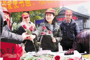 2月16日,绍兴志愿者在鲁迅故里义卖书画、玫瑰,筹措环保经费。