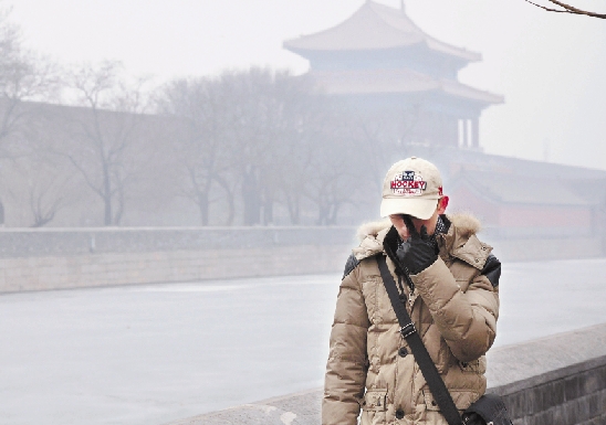 2月21日,一名游客从雾霾笼罩下的北京故宫旁走过。当日18时,中央气象台继续发布霾黄色预警,预计2月21日20时至22日20时,北京、天津、河北中南部、山东西部、河南北部、陕西关中地区、山西南部等地气象条件不利于空气中污染物扩散,大部地区有中度霾,京津冀部分地区有重度霾。 新华社发(王俊峰 摄) |