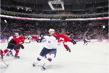 2月21日,在冬奥会男子冰球半决赛中,加拿大队以1比0战胜美国队,晋级决赛。图为加拿大队球员贝恩(右)被美国队球员巴克斯撞飞倒地。 新华社发