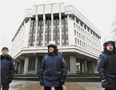 2月27日,在乌克兰辛菲罗波尔,内务部工作人员在乌克兰克里米亚自治共和国议会大楼外警戒。 新华社发
