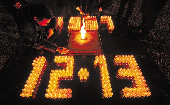 这是2013年12月12日,在侵华日军南京大屠杀遇难同胞纪念馆举行的“为南京大屠杀遇难者守灵仪式暨和平烛光祭”活动上,人们为遇难同胞点燃红烛。