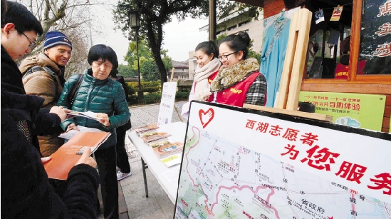 杭州平湖秋月微笑亭,志愿者的服务令游客备感温暖亲切。