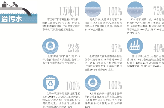 市区每年新增截污量1万吨/日;2015年底前完成新登污水厂扩建工程及配套管网建设;2016年完成富阳市污水厂(四期)主体工程建设。