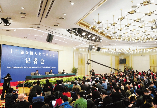 3月7日上午,商务部部长高虎城在记者会上回答中外记者的提问。 新华社记者 沈伯韩 摄