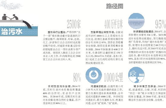 农村生活污水治理:2014年底,农村生活污水收集处理覆盖40%的自然村,受益农户达到30%。到2016年底,实现农村生活污水收集处理自然村全覆盖,农户受益率达到80%以上。