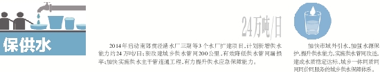 2014年启动南郊贯泾港水厂三期等3个水厂扩建项目,计划新增供水能力约24万吨/日;新改建城乡供水管网200公里,有效降低供水管网漏损率;加快实施供水主干管连通工程,有力提升供水应急保障能力。