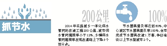 2014年实施城乡一体化供水管网的改造工程200公里,城市供水管网漏损率小于12%,乡镇供水管网漏损率在现在基础上下降5个百分点。