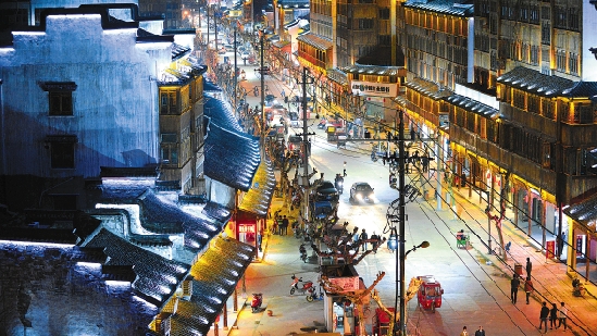 白墙黑瓦、雕花门窗,3月18日晚,桐乡崇福镇崇德中路显得格外靓丽。为配合古镇保护,崇福镇进行了房屋立面改造,还原其古色古香的风貌。