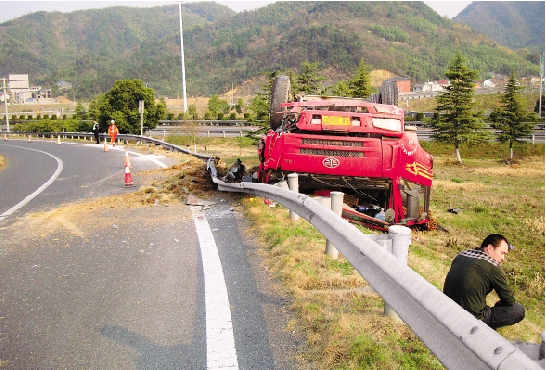3月18日下午,杭徽高速一辆大货车在下匝道翻车(图片由高速交警部门提供)。