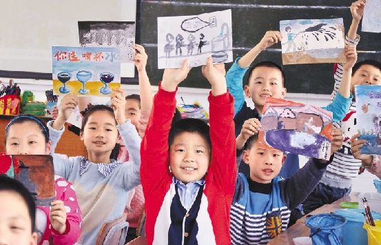 3月18日,在海宁实验小学美术教室里,五年级2班的学生描绘和展示水环境保护画作,表达对“五水共治”的愿景和建议。