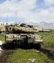 3月19日,军队的坦克驻扎在戈兰高地迈季代勒舍姆斯镇。以色列国防军发言人当日证实,以色列战机轰炸了叙政府军的一个训练营、一个炮兵基地和戈兰高地叙控区的两个军事总部。这是对叙利亚18日“制造炸弹袭击事件”的报复。 新华社发