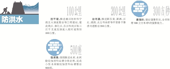 治河道:推进鄞东南、鄞西、江北、镇海、北仑和余慈等平原骨干排涝河道整治200公里。