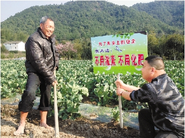 村委会主任董云义(右)在何德寿插着承诺牌的田头聊天。