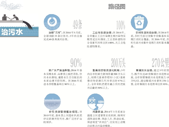 治理“三河”:到2014年5月底,全部消除23条垃圾河,2年内全面完成49条黑臭河治理。
