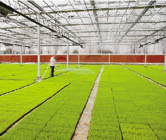 金华粮丰植保专业合作社的玻璃温室内,农户正在给秧苗施肥。 罗斐茜 摄