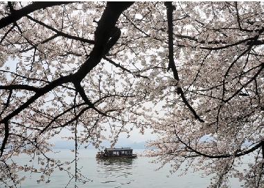 3月25日中午,杭州雨过天晴,平湖秋月附近两棵最大的樱花树已盛开,吸引了许多游客和摄影爱好者。 连国庆 摄