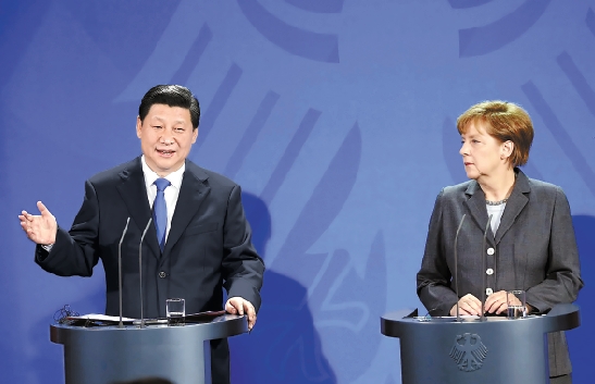 3月28日,国家主席习近平在柏林与德国总理默克尔共同会见记者。 新华社记者 鞠鹏 摄