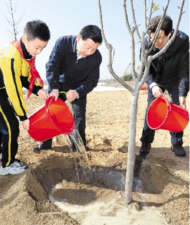 这是习近平同大家一起给刚栽下的树苗浇水。 新华社记者 李涛 摄