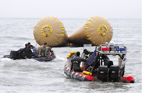 4月19日,在韩国全罗南道珍岛附近海域,救援人员在“岁月”号客轮沉没地点搜救。 新华社发