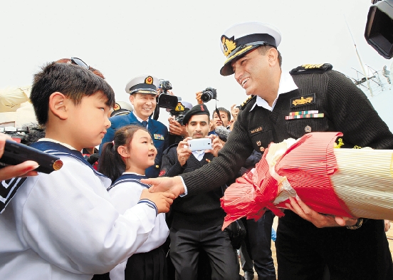 4月20日,青岛市小朋友向巴基斯坦海军“沙姆谢尔”号护卫舰舰长扎法尔上校献花。 新华社记者 查春明 摄