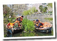 工作人员在沧海河修剪水上植物。