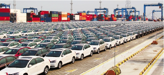 吉利汽车宁波基地生产的帝豪EC7,成为国内轿车首款“出口免验产品”。图为帝豪EC7轿车正从梅山保税港区整车专用码头整装出口。浙江汽车消费的市场大,发展汽车产业的比较优势突出、潜力很大。