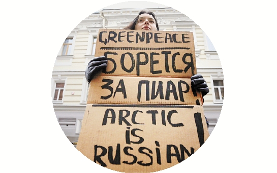 当地时间2013年10月24日,俄罗斯莫斯科,一名女子手持标语称“北极是俄罗斯的!”站在荷兰驻莫斯科大使馆前。 视野网供图