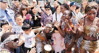 参加动漫节的非洲舞蹈艺员与杭州市民狂欢。 记者 吴煌 吴元峰 摄