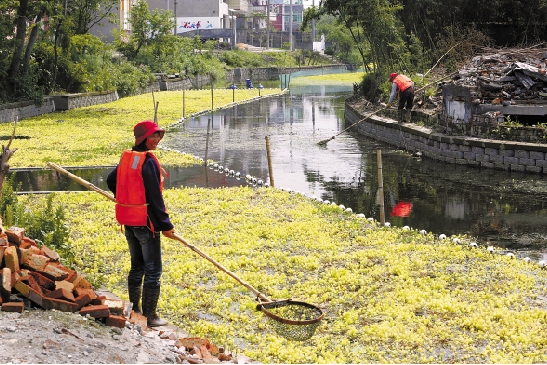 南湖区新丰镇在河面上种了狐尾藻,加上河道上有保洁员不定期清理水上垃圾,水质明显改善。