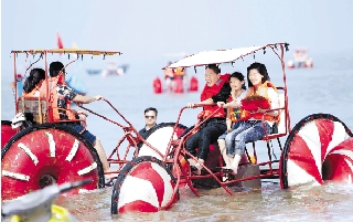 5月2日,在苍南县雾城景区,游客在沙滩上玩耍。好天气让不少游客下海享受碧海蓝天。 通讯员 苏巧将 摄