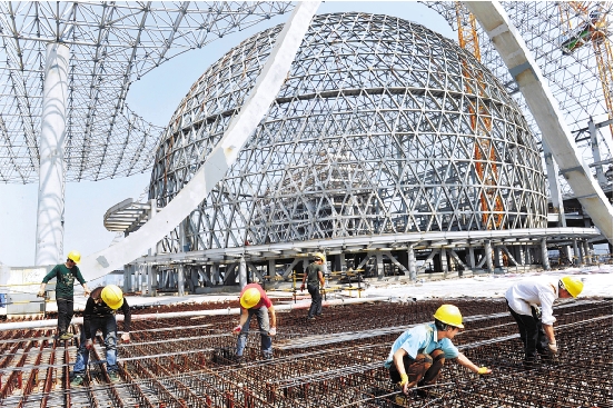 5月2日,在省重点工程杭州国际博览中心工地上,中建八局的3000多名建设者坚守岗位,为杭州城市建设出力。