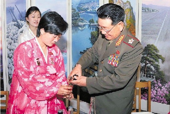 朝鲜五一劳动节庆祝活动1日在新建的平壤金正淑纺织工厂举行。图为黄炳誓(右)为工人代表倒饮料。 视野网供图
