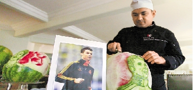 5月7日,在圣保罗圣·拉斐尔酒店中,厨师奥兰达在西瓜上雕刻出克里斯蒂亚诺·罗纳尔多和梅西等球星的样子,以此迎接即将到来的2014巴西世界杯。 新华社发