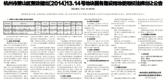 杭州市萧山区萧政储出〔2014〕13、14号地块国有建设用地使用权挂牌出让公告