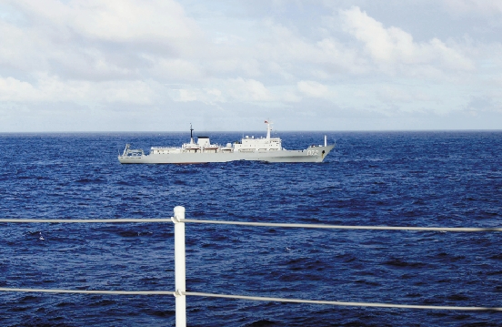 | “竺可桢”号远洋综合调查测量船(海军872号船)9日晨抵达南印度洋任务海区,与井冈山舰编队会合交接。这是中国海军派出的第10艘搜寻马航失联客机的舰船,将接替其他海军舰船执行海底搜寻任务。图为5月9日“竺可桢”号测量船与井冈山舰编队进行任务交接。 新华社发 |