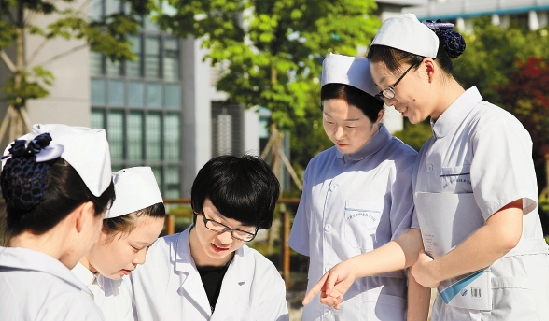 | 5月12日是国际护士节。提起护士,人们脑海中总会浮现出温婉可人的女子形象。如今,随着卫生健康事业的发展,不少医院悄然出现了“护士先生”。目前,男护士约占护士人数的1%。图为“护士先生”宁波卫生职业技术学院2012护理15班余博文(中),俨然成为众多“美小护”中的一抹亮色。 通讯员 崔雨 记者 王婷 摄 |