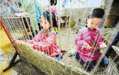 宁波市第一幼儿园在有限空间里辟出儿童专用实践场地,设立了“美味下饭”等10多个儿童工作室,图为5月12日,小朋友们在稻草房里做手工。 本报记者 潘海松 摄