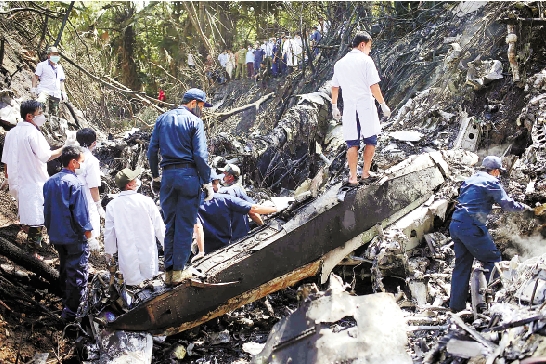 5月17日,在老挝川圹省纳德村附近,救援人员在坠机地点进行搜救。 新华社发