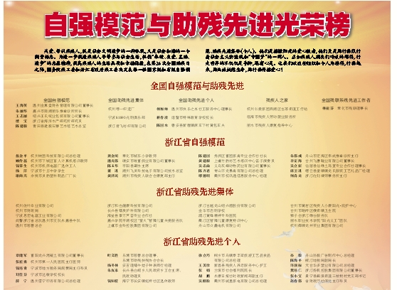 关爱、帮扶残疾人,既是社会文明进步的一种体现,又是社会和谐的一个衡量标志。为进一步促进残疾人平等参与社会生活,弘扬“奉献、友爱、互助、进步”的志愿精神,提高残疾人的生活品质和幸福指数,在第24次全国助残日之际,国务院残工委和浙江省政府残工委决定表彰一批国家级和省级自强模范、助残先进集体(个人)。他们是播撒阳光的爱心使者,他们更是用行动践行着社会主义价值观和“中国梦”的一群人。正如残疾人朋友们呼喊的那样,行走世界的不仅仅是手脚,还有心灵。让我们以这些组织和个人为榜样,行动起来,用热诚抚慰生命,用行动传播爱心!
