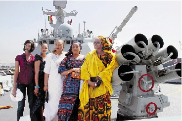 5月14日,塞内加尔达喀尔港,当地妇女在到访的中国军舰上合影。当日,中国海军第十六批护航编队抵达塞内加尔达喀尔港,开始对塞内加尔进行为期3天的友好访问。 新华社记者 邰剑秋摄