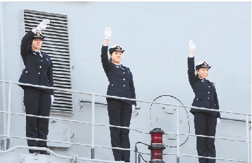 2013年02月16日,山东省青岛市,中国海军第十四批索马里、亚丁湾护航编队出航,第一次有女兵随舰护航。 视野网供图