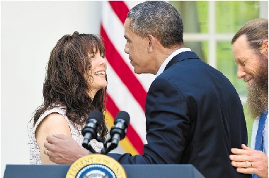 5月31日,在华盛顿白宫玫瑰园,被释放美军士兵鲍·伯格达尔的母亲贾妮在对媒体发表讲话后与美国总统奥巴马拥抱。 新华社发