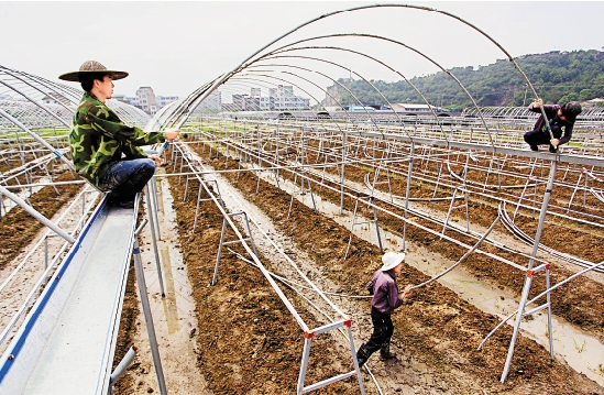 | 连日来,温岭市箬横铁峰家庭农场工人正在搭建钢管连栋大棚。这是多年在外经营食品的温岭籍浙商张军辉投资1000多万元建设的,面积达120亩,将栽种火龙果等热带水果。 温岭日报记者 刘振清 摄 |